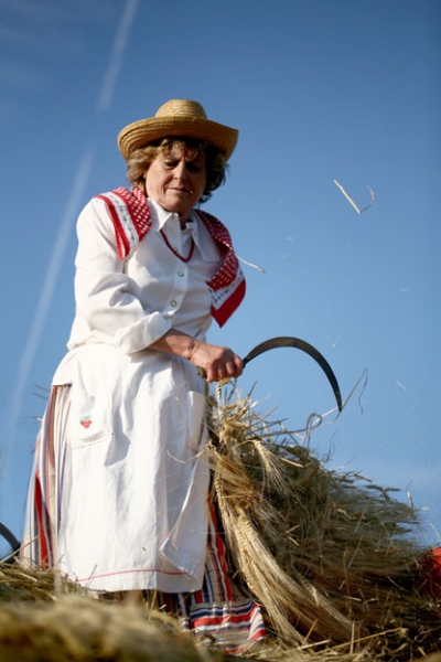 La mietitura del grano si iniziava verso la metà del mese di giugno; il grano si tagliava prima con le falci, poi con le “mietilega”, macchine che tagliavano e legavano il grano, trainate dai buoi, per poi passare alle “mietilega” a motore.
